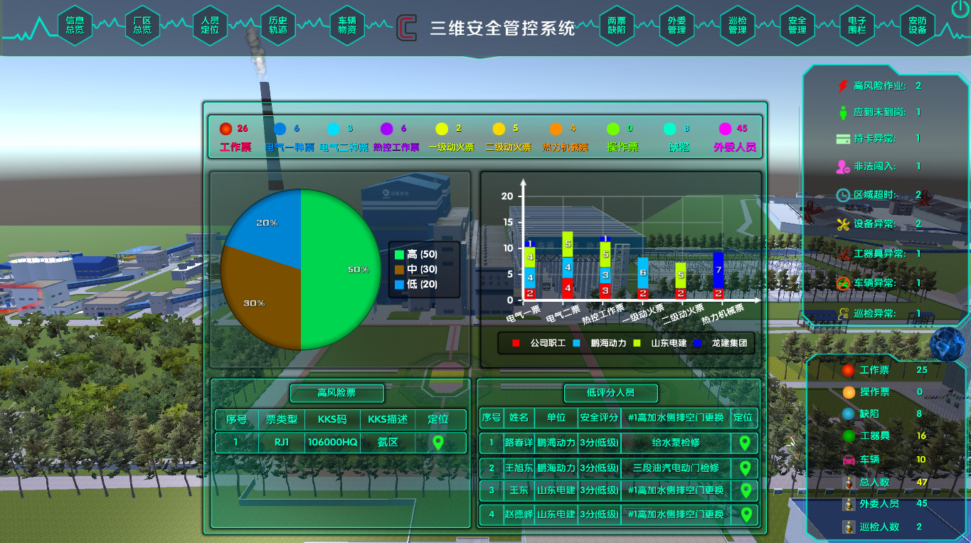 系統(tǒng)把整個(gè)廠區(qū)劃分為N個(gè)作業(yè)區(qū)域,根據(jù)作業(yè)區(qū)域安全風(fēng)險(xiǎn)的高低做出相應(yīng)的等級(jí)劃分,便于重點(diǎn)區(qū)域重點(diǎn)監(jiān)控。根據(jù)各人員的工作崗位和工作內(nèi)容進(jìn)行區(qū)域授權(quán),對(duì)人員闖入未授權(quán)區(qū)域系統(tǒng)立即報(bào)警。同時(shí)系統(tǒng)會(huì)接入ERP中的兩票、缺陷信息,根據(jù)兩票、缺陷信息中的區(qū)域位置及設(shè)備的KKS編碼,把兩票、缺陷作業(yè)劃分到相應(yīng)的區(qū)域中,實(shí)現(xiàn)兩票、缺陷及作業(yè)人員分區(qū)域列表展現(xiàn)和三維展現(xiàn),方便查看與管理。定位系統(tǒng)自動(dòng)記錄巡點(diǎn)檢人員的巡點(diǎn)檢時(shí)長、巡點(diǎn)檢次數(shù)并與預(yù)設(shè)的巡點(diǎn)檢路線進(jìn)行比對(duì),自動(dòng)統(tǒng)計(jì)分析巡點(diǎn)檢人員的到位率與偏差等。對(duì)于巡點(diǎn)檢人員偏離巡點(diǎn)檢路線及漏檢等及時(shí)短信與APP推送報(bào)警信息。4、高風(fēng)險(xiǎn)作業(yè)管理密閉空間作業(yè)屬于高風(fēng)險(xiǎn)作業(yè),安全風(fēng)險(xiǎn)較高。針對(duì)密閉空間作業(yè)的環(huán)境特點(diǎn),采用電池供電的移動(dòng)式定位設(shè)備臨時(shí)固定在密閉空間內(nèi),天線放置在密閉空間外,確保定位無線信號(hào)傳輸?shù)目煽啃浴?/span>人員攜帶定位標(biāo)簽進(jìn)入密閉空間系統(tǒng)可實(shí)時(shí)監(jiān)督密閉空間內(nèi)人員數(shù)量。同時(shí)可加設(shè)便攜式無線攝像頭,以便實(shí)時(shí)監(jiān)控作業(yè)人員。高空作業(yè)、大型設(shè)備吊裝及腳手架搭設(shè)過程中容易出現(xiàn)安全事故,如未掛安全帶墜落,交叉作業(yè)、高空落物等風(fēng)險(xiǎn),這類亦屬于高風(fēng)險(xiǎn)作業(yè)。在作業(yè)前假設(shè)臨時(shí)虛擬電子圍欄,防止無關(guān)人員進(jìn)入工作區(qū),同時(shí)利用圖形識(shí)別技術(shù)檢測(cè)是否正確佩戴安全帽和安全帶,發(fā)現(xiàn)異常立即報(bào)警。5、多系統(tǒng)聯(lián)動(dòng)系統(tǒng)支持接入電廠視頻監(jiān)控系統(tǒng),在三維電子地圖上顯示視頻監(jiān)控位置,任意切換調(diào)取視頻監(jiān)控。可實(shí)現(xiàn)快速查找、單點(diǎn)回放、圖像識(shí)別等功能。同時(shí)可基于人員當(dāng)前位置自動(dòng)調(diào)取對(duì)應(yīng)的視頻監(jiān)控,對(duì)人員行走到其他位置自動(dòng)切換到相應(yīng)監(jiān)控畫面。對(duì)于發(fā)生異常的情況,可基于人員歷史軌跡不同位置及不同時(shí)段調(diào)取相應(yīng)位置相應(yīng)時(shí)間段的歷史視頻監(jiān)控,與歷史軌跡聯(lián)動(dòng)播放,方便事故分析及責(zé)任劃定。